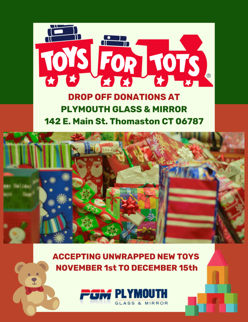 This holiday season, Plymouth Glass & Mirror is proud to partner with the U.S. Marine Corps Toys for Tots program to bring joy to local children. From November 1 through December 15, 2025, our showroom in Thomaston will serve as a drop-off location for new, unwrapped toys.